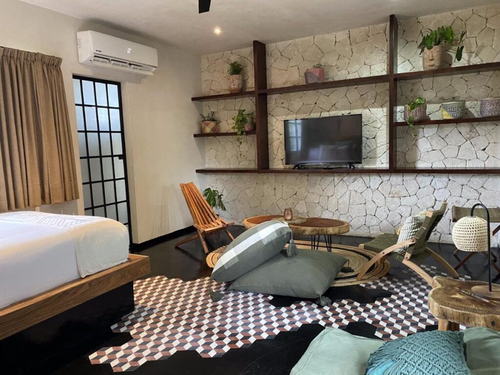 Hotel #107 is just 3km (2 miles) from Tulum’s iconic ruins and picturesque beaches. This prime location offers easy access to a wide range of amenities. Guests will appreciate the proximity to supermarkets, banks, restaurants, bus stops, and car rental agencies, ensuring a seamless and connected experience in this vibrant town.
